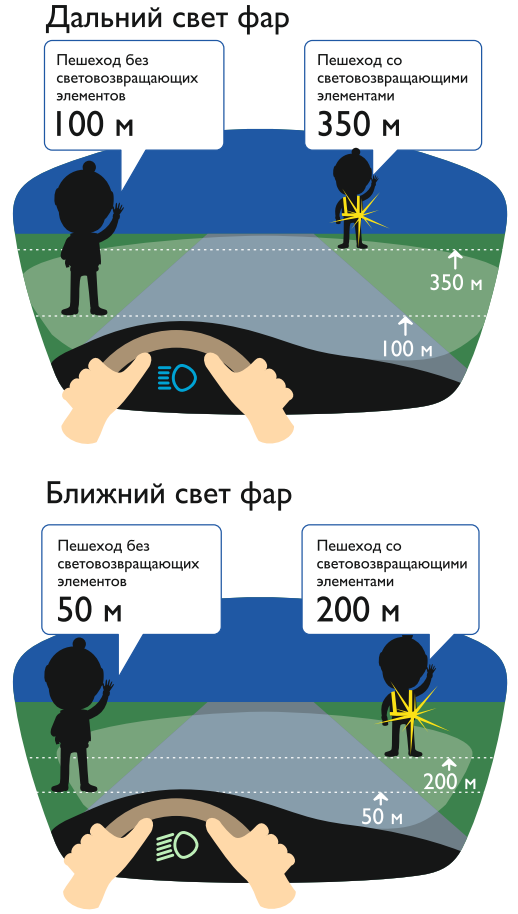 При движении с ближним светом фар водитель автомобиля способен увидеть пешехода на дороге на расстоянии 25-50 метров. Если пешеход применяет световозвращатель, то это расстояние увеличивается до 150-200 метров. А при движении автомобиля с дальним светом фар дистанция, на которой пешеход становится виден, с применением световозвращателей увеличивается со 100 метров до 350 метров. Это даёт водителю 15-25 секунд для принятия решения.